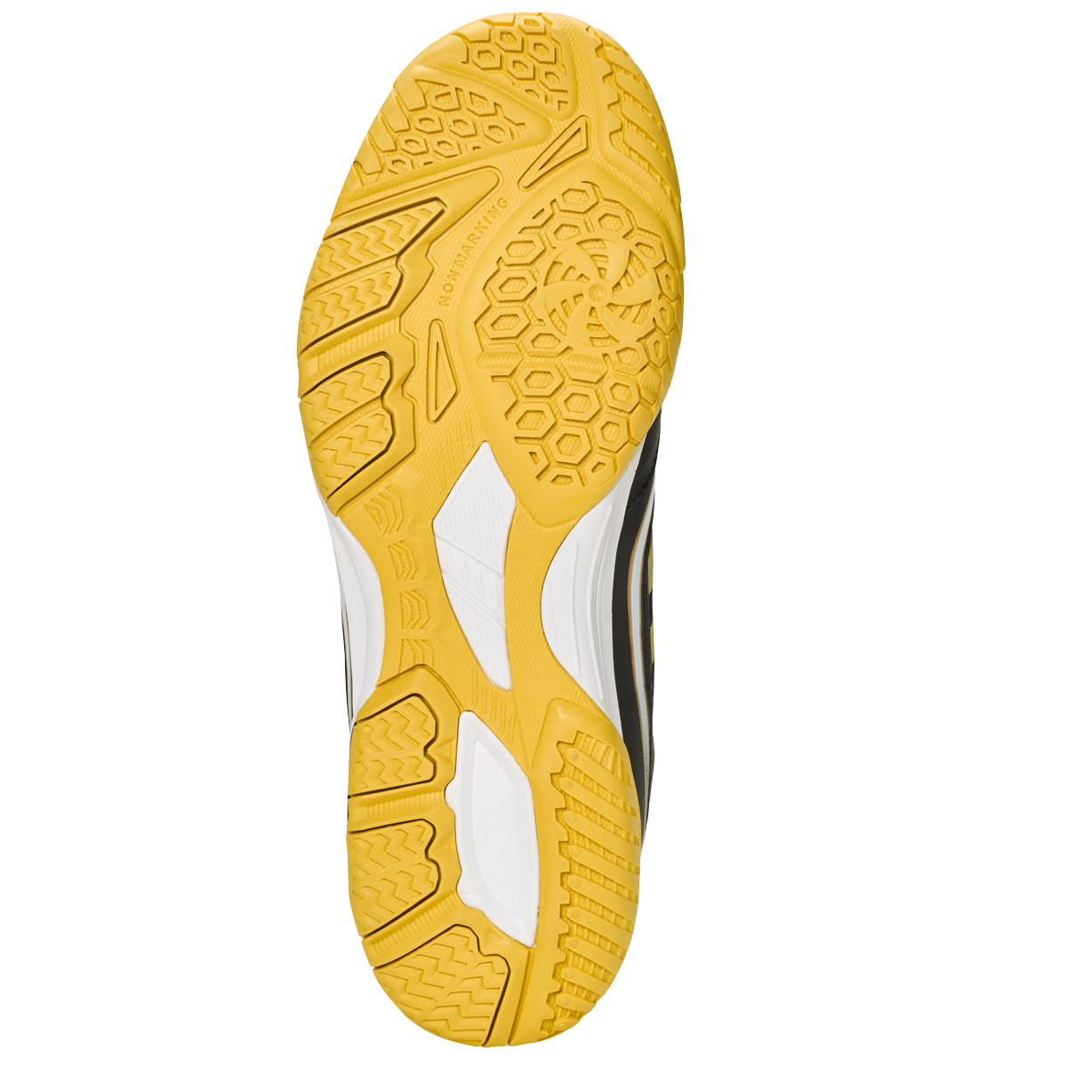 Mit der non-marking Vollgummi-Sohle hast du auf jedem Hallenboden maximalen Halt. Speziell entwickelte Wellen- und Wabenstrukturen sorgen für Stabilität und Flexibilität in jeder Bewegung. Das Spiralelement im Vorderfußbereich unterstützt schnelle Richtungswechsel, während die griffige Struktur das Wegrutschen verhindert.