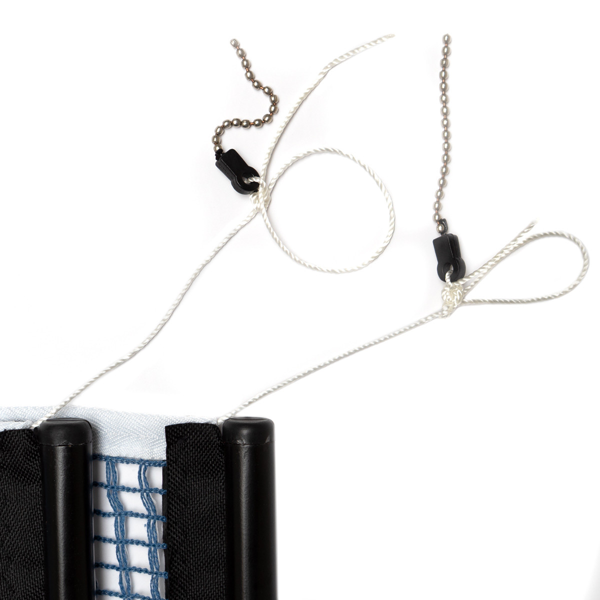 Ein in einen schwarzen Netzpfosten integriertes Ersatznetz mit den Netzmaschenfarben: schwarz, blau und grün.