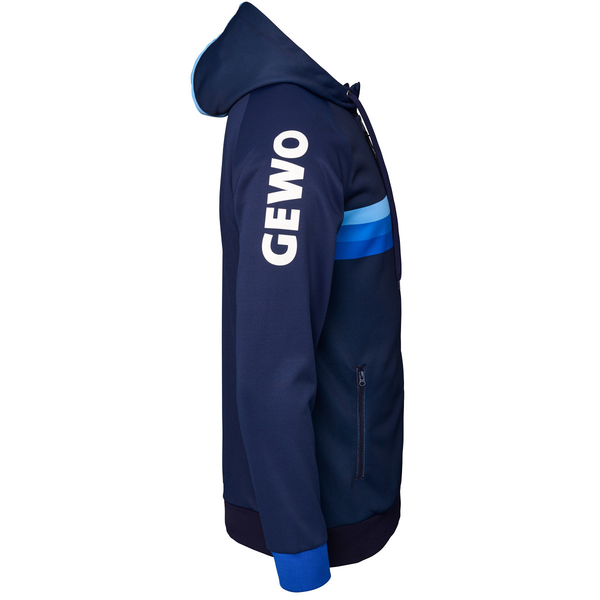 Das GEWO Logo ist vorne links auf der Brust, mittig auf der Rückseite sowie auf dem rechten Oberarm platziert und unterstreicht den sportlich-professionellen Charakter.