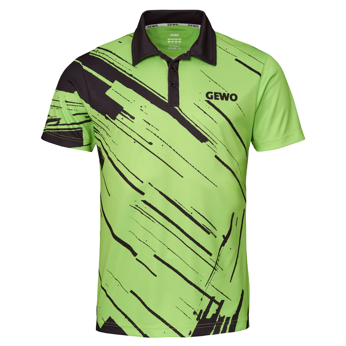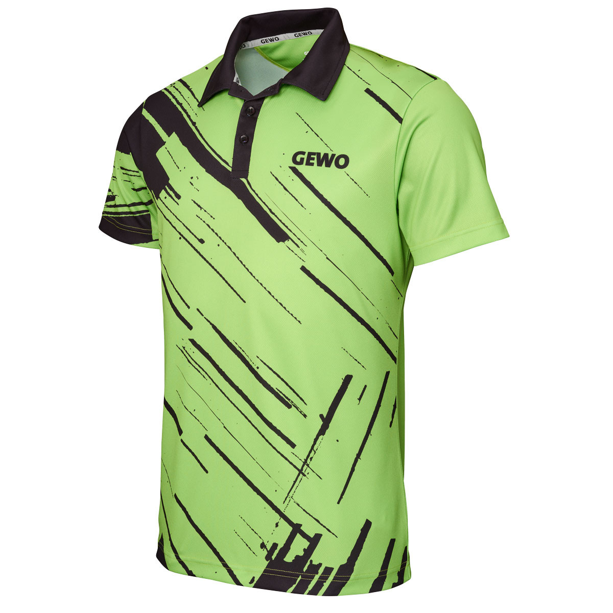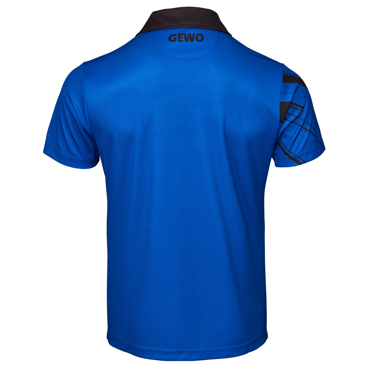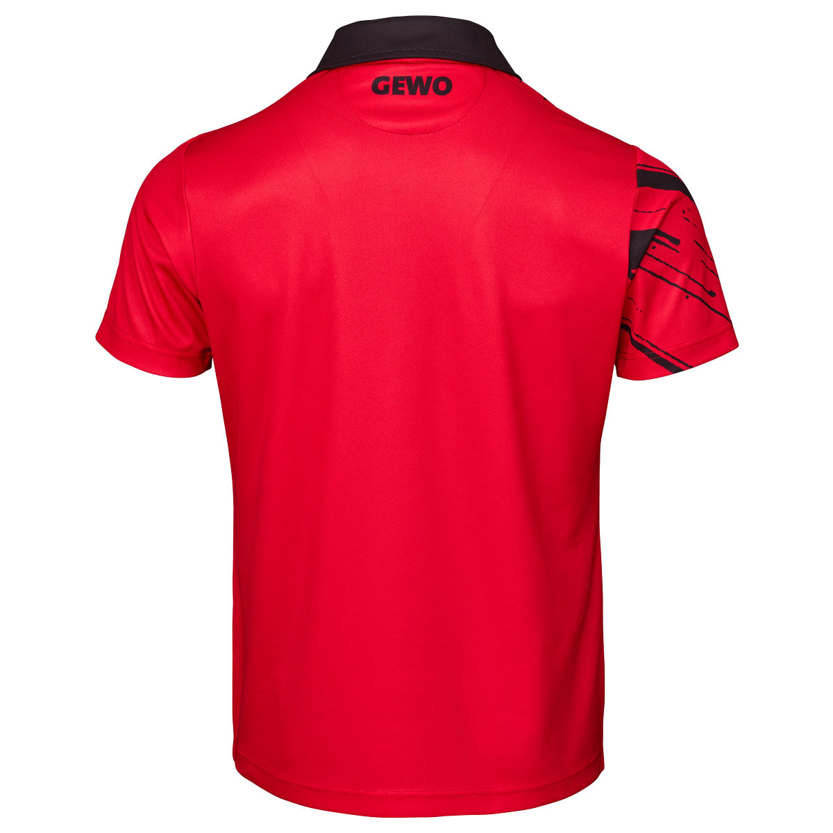 Der linke Ärmel sowie die Rückseite sind bewusst ruhig gehalten, wodurch die grafische Gestaltung der Front besonders hervorgehoben wird. Das GEWO-Logo ist vorne rechts auf der Brust positioniert und wird durch ein weiteres, dezent integriertes Logo im Nackenbereich ergänzt. So entsteht ein harmonisches, markentypisches Gesamtbild mit hohem Wiedererkennungswert auf und neben dem Tischtennistisch.