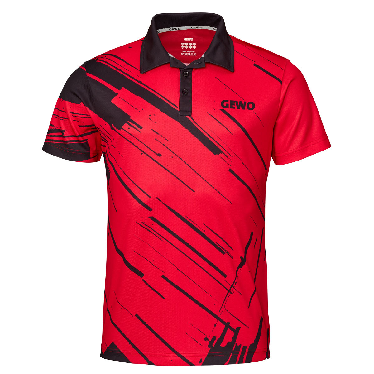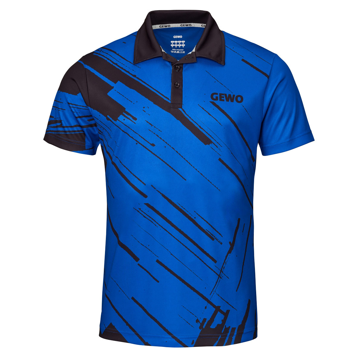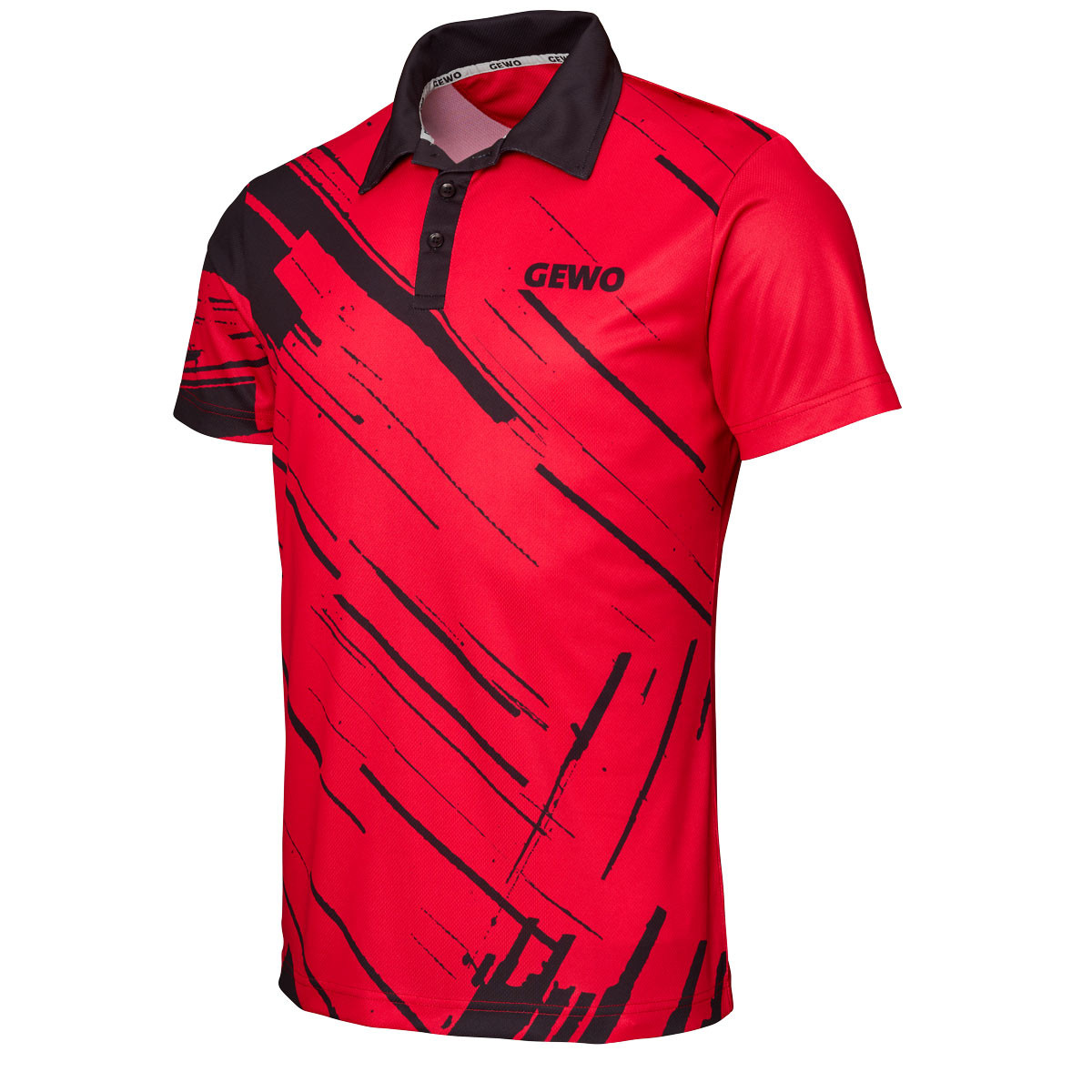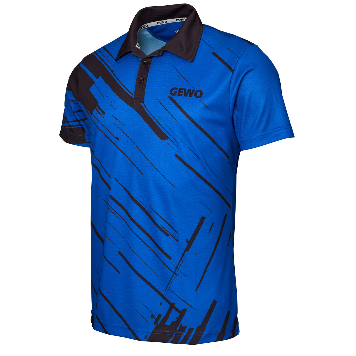 Der linke Ärmel sowie die Rückseite sind bewusst ruhig gehalten, wodurch die grafische Gestaltung der Front besonders hervorgehoben wird. Das GEWO-Logo ist vorne rechts auf der Brust positioniert und wird durch ein weiteres, dezent integriertes Logo im Nackenbereich ergänzt. So entsteht ein harmonisches, markentypisches Gesamtbild mit hohem Wiedererkennungswert auf und neben dem Tischtennistisch.