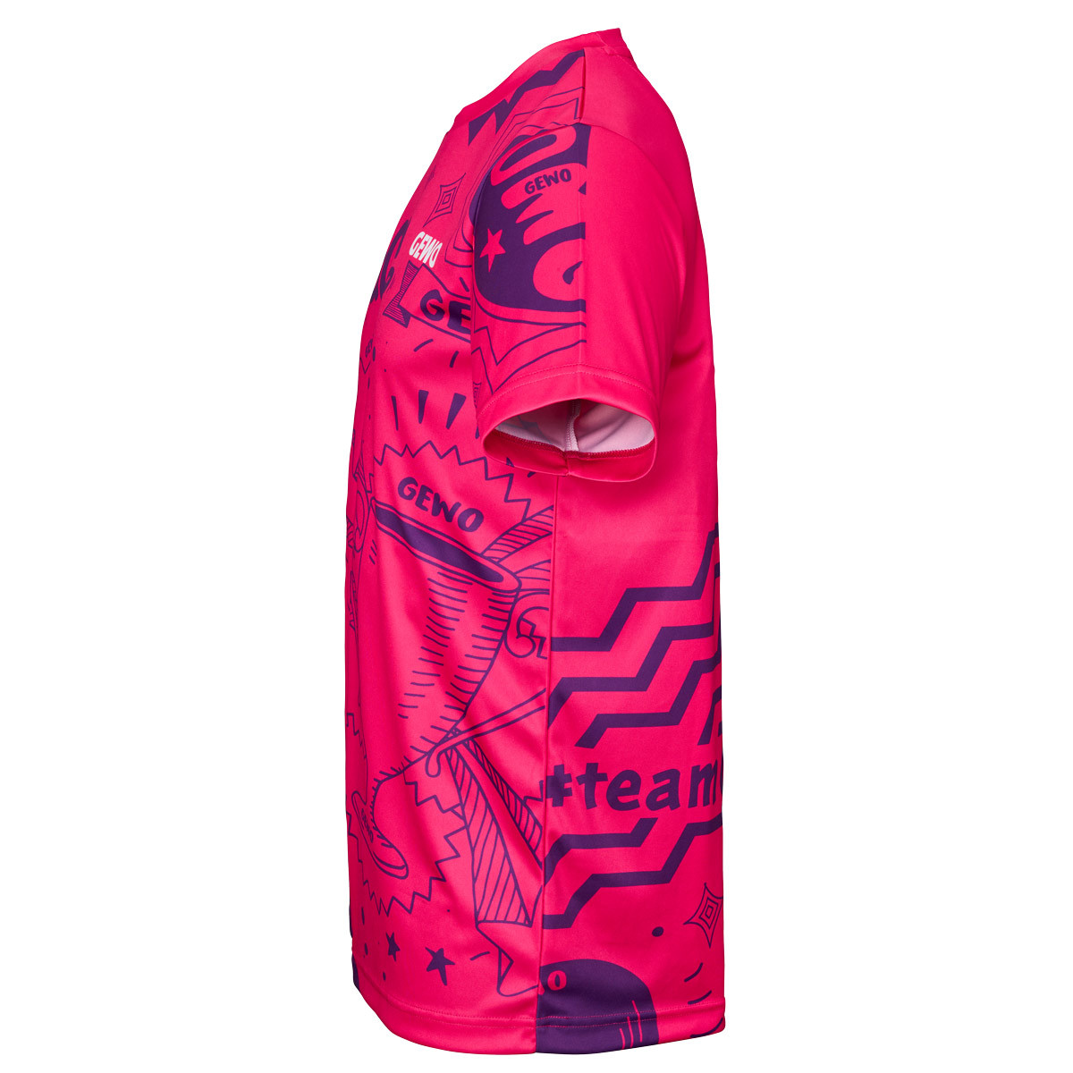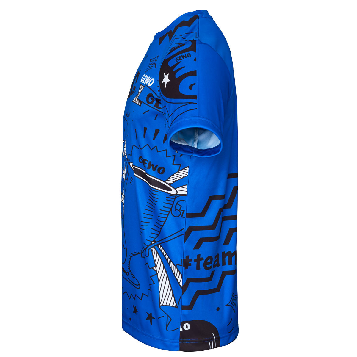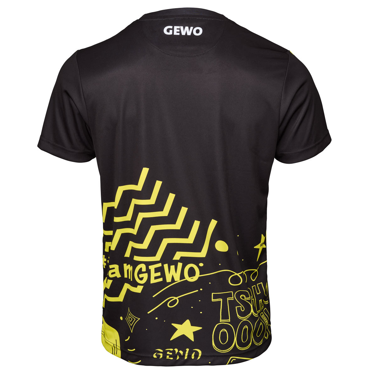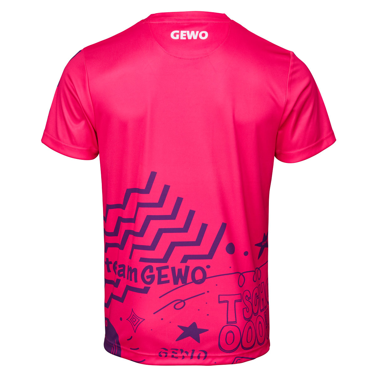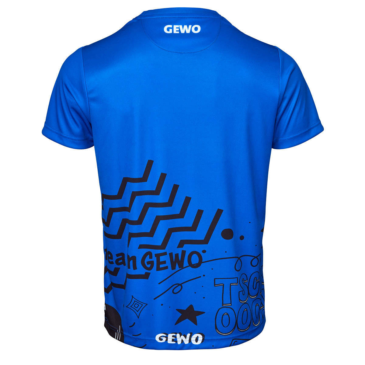 Die Rückseite greift grafische Elemente im unteren Bereich auf und sorgt für ein stimmiges Erscheinungsbild. Das GEWO Logo auf Brusthöhe fügt sich harmonisch in das Design ein und unterstreicht den sportlichen Anspruch.
