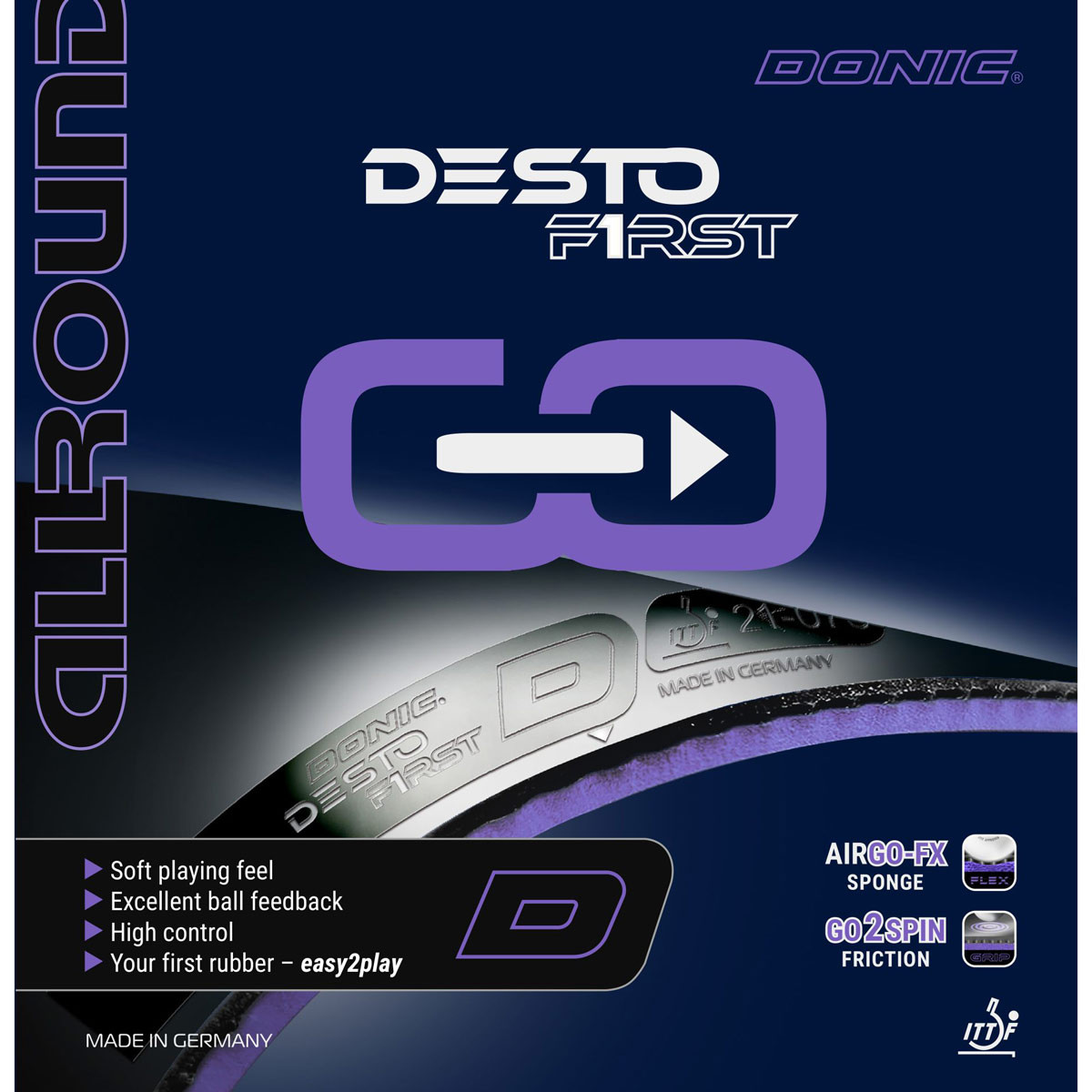 Das DONIC GO-Konzept wurde speziell für Einsteiger entwickelt und unterstützt das Erlernen der Grundtechniken. Der purple Kontrollschwamm (Purple-2-CTRL) mit AirGO-FX Technologie (37,5°) sorgt für ein präzises Ballgefühl und hohe Kontrolle, während die griffige Go2Spin-Oberfläche den Ball zuverlässig ankoppelt und kontrollierten Spin ermöglicht.