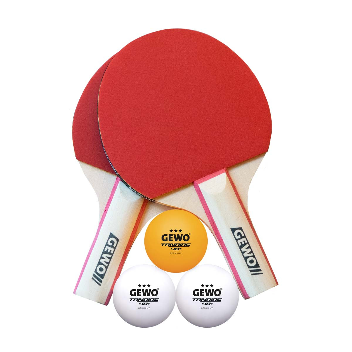 Das Set besteht aus zwei kleinen Schlägern mit kompaktem Griff und Schlägerblatt sowie drei Trainingsbällen.