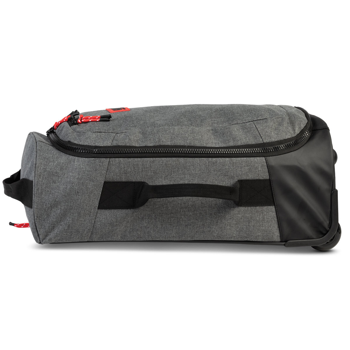 Der Spy Trolley in Größe M ist ein echtes Raumwunder. Der weiche, aber robuste dunkelgraue Stoff bietet einiges an Flexibilität, während der stabile schwarze Kunststoffreißverschluss die Abdeckung sicher ver-schließt. Er kombiniert sportliche Eleganz mit Funktionalität. Er ist die perfekte Wahl für Spieler, die viel un-terwegs sind und ihre Ausrüstung sicher transportieren möchten. Die Räder sind leichtgängig und der auszieh-bare Griff sorgt für einen kinderleichten Transport. Wird der Griff nicht mehr benötigt, kann er zusammenge-schoben werden und verschwindet in der hinteren Tasche, die mit einem Reißverschluss geschlossen werden kann. Das Seiten- sowie Bodenteil ist mit einem mattschwarzen Kunststoffmaterial überzogen und schützt so vor Feuchtigkeit und Schmutz. Das stabile Seitenteil sorgt für einen sicheren Stand.