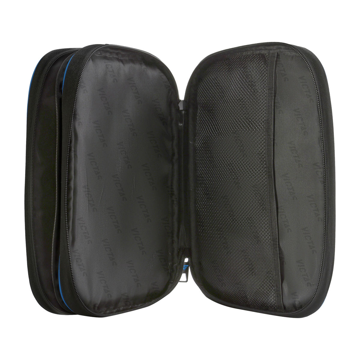 Die durchdachte Innenaufteilung sorgt für Ordnung und sicheren Halt. Ein innenliegender Mesh-Einsatz fixiert den Inhalt zuverlässig, während drei unterteilte Innenfächer zusätzlichen Platz für kleine Utensilien bieten. Das moderne Design mit großem VICTAS-Schriftzug verleiht der Hülle eine sportliche, klare Optik.